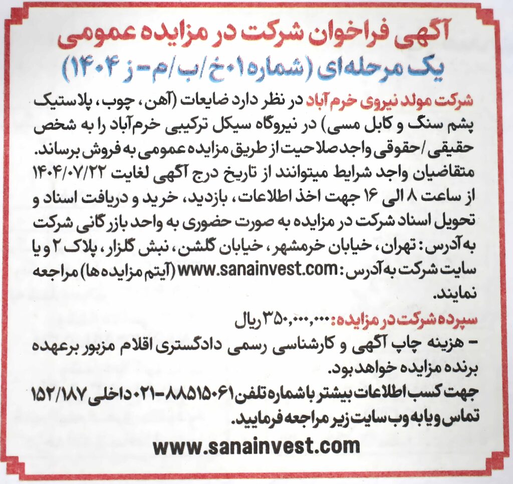 شرکت مولد نیروی خرم آباد در نظر دارد ضایعات (آهن، چوب، پلاستیک، پشم، سنگ و کابل مسی) در نیروگاه سیکل ترکیبی خرم آباد را به شخص حقیقی/حقوقی واجد صلاحیت از طریق مزایده عمومی به فروش برساند. متقاضیان واجد شرایط میتوانند از تاریخ درج آگهی لغایت ۱۴۰۴/۰۷/۲۲ از ساعت ۸ الی ۱۶ جهت اخذ اطلاعات، بازدید، خرید و دریافت اسناد و تحویل اسناد شرکت در مزایده به صورت حضوری به واحد بازرگانی شرکت به آدرس: تهران، خیابان خرمشهر، خیابان گلشن، نبش گلزار، پلاک دو و یا سایت شرکت به آدرس: www.sanainvest.com (آیتم مزایدهها) مراجعه نمایند.