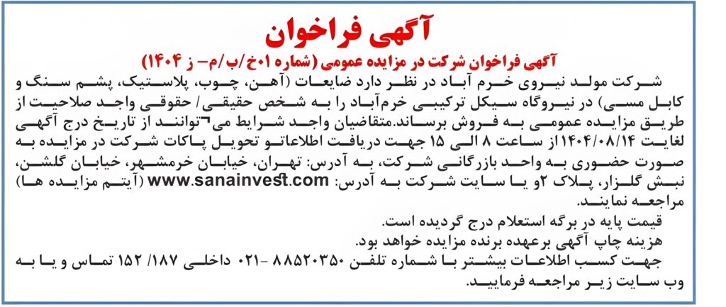 شرکت مولد نیروی خرم آباد در نظر دارد ضایعات (آهن، چوب، پلاستیک، پشم سنگ و کابل مسی) در نیروگاه سیکل ترکیبی خرمآباد را به شخص حقیقی/ حقوقی واجد صلاحیت از طریق مزایده عمومی به فروش برساند. متقاضیان واجد شرایط میتوانند از تاریخ درج آگهی لغایت ۱۴۰۴/۰۸/۱۴ از ساعت ۸ الی ۱۵ جهت دریافت اطلاعات و تحویل پاکات شرکت در مزایده به صورت حضوری به واحد بازرگانی شرکت، به آدرس تهران، خیابان خرمشهر، خیابان گلشن، نبش گلزار، پلاک ۲ و یا سایت شرکت به آدرس www.sanainvest.com (آیتم مزایدهها) مراجعه نمایند.