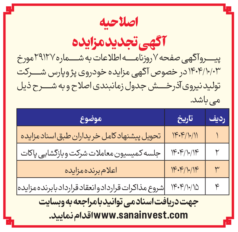 پیرو آگهی صفحه ۷ روزنامه اطلاعات به شماره ۲۹۱۲۷ مورخ ۱۴۰۴/۱۰/۰۳ در خصوص آگهی مزایده خودروی پژو پارس شرکت تولید نیروی آذرخش جدول زمانبندی اصلاح و به شرح ذیل میباشد.